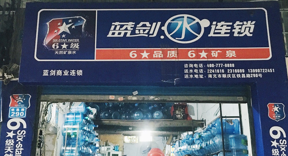 代理品牌:天然礦泉水系列(藍劍飲品集團南充地區總代理),包裝飲用水系列(浸水、金品、水之源、凌云山、山坪道、冰樂氏),瓶裝水系列(冰川時代Q1、農夫山泉、怡寶)等…